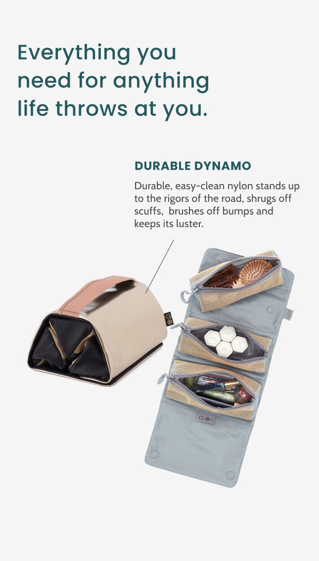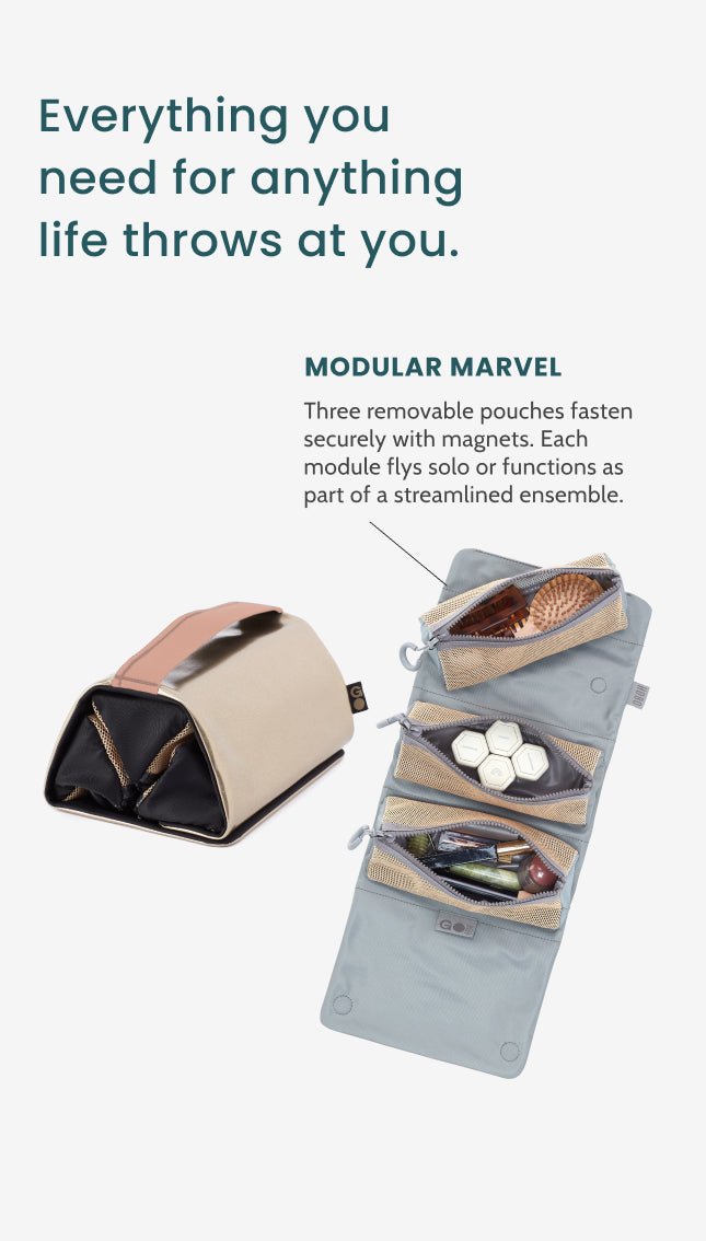 NGL: Not gonna lie, there’s something special about this triple-pouch, transforming kit. Configure it, roll it—this kit bends to your will and the demands of your day. Pack cables, combs, or clips, with modular magic. Grab the wide carry-handle and carry on.