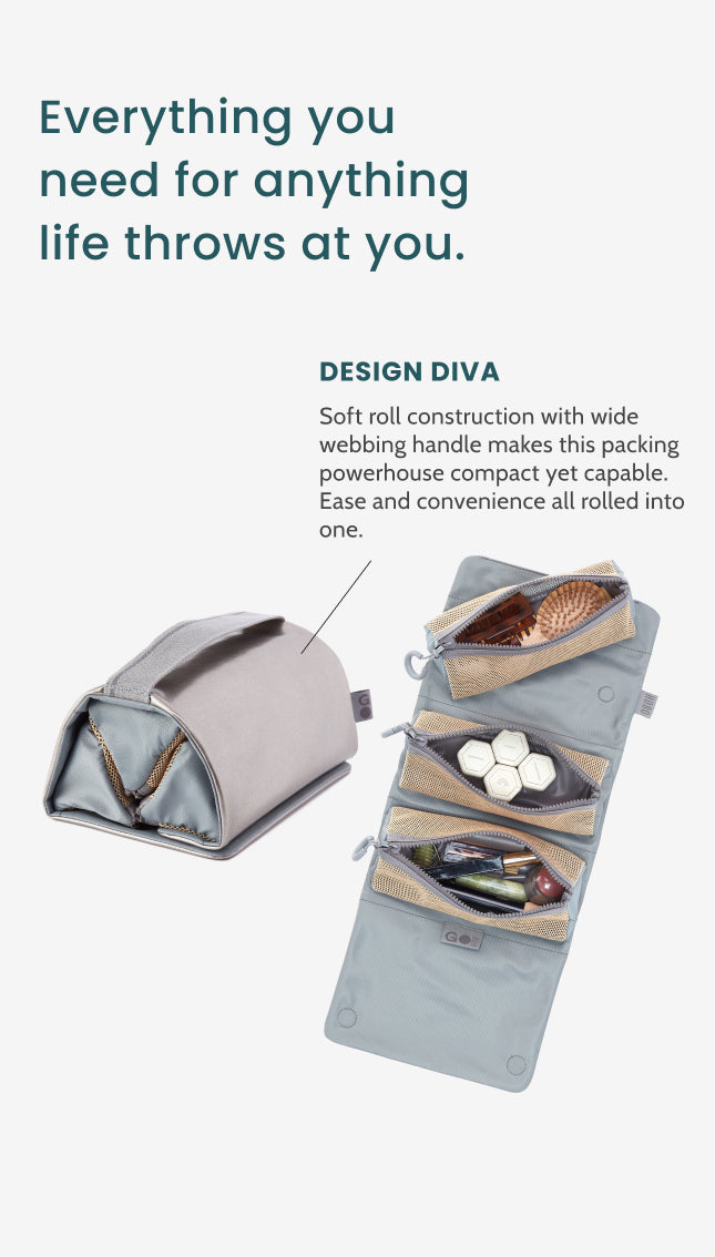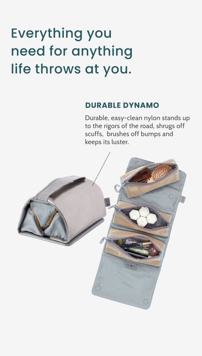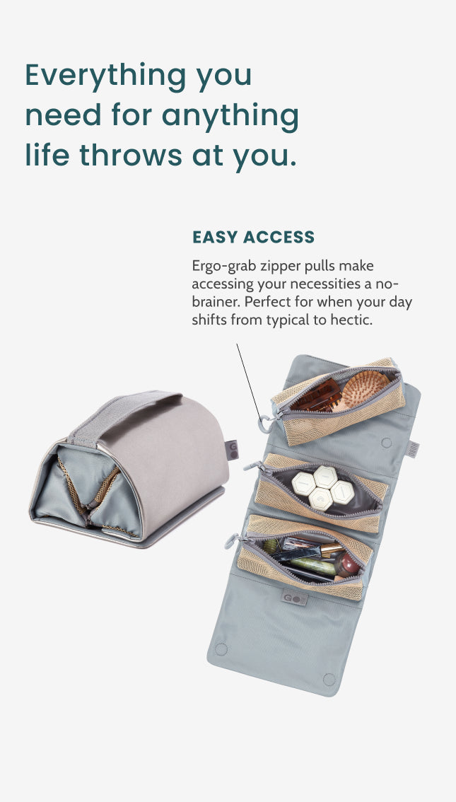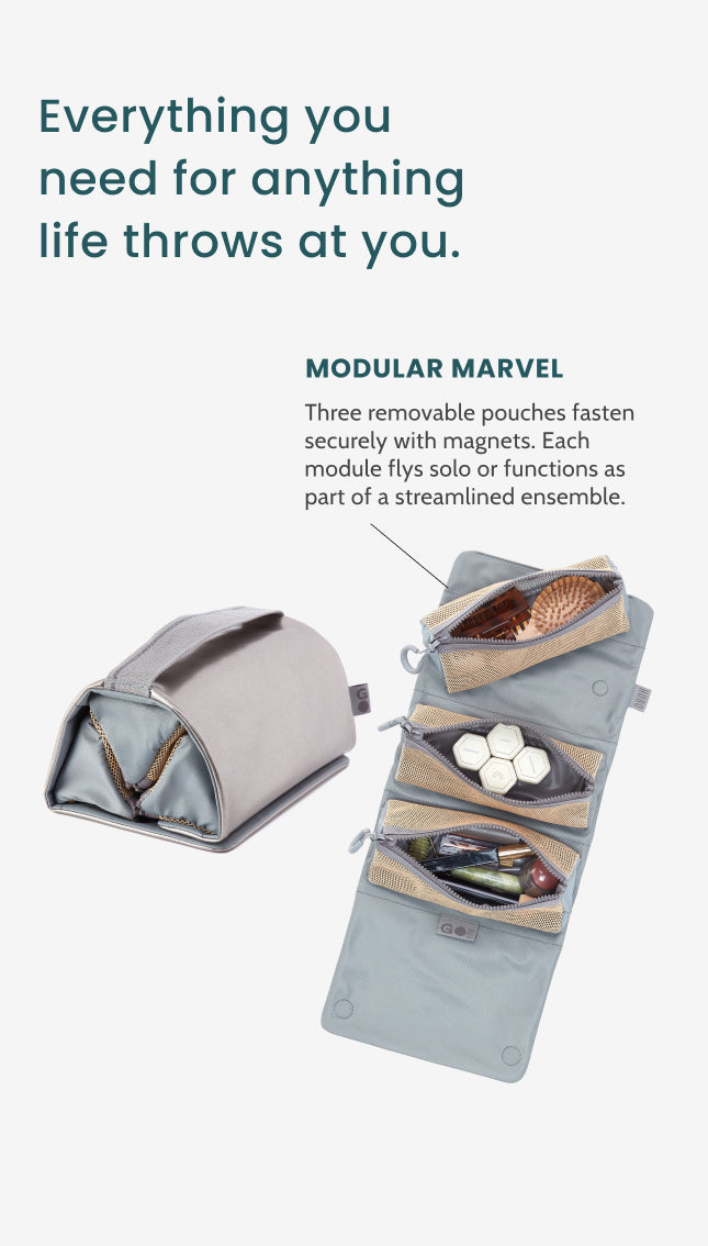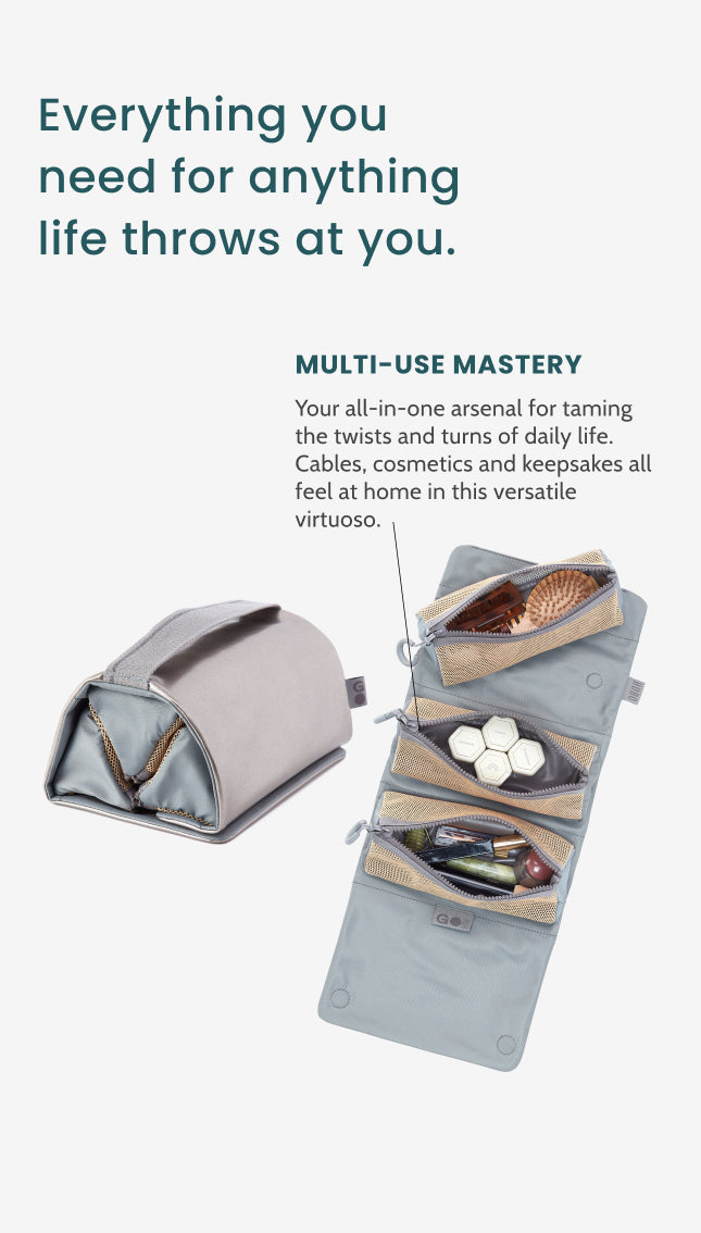 NGL: Not gonna lie, there’s something special about this triple-pouch, transforming kit. Configure it, roll it—this kit bends to your will and the demands of your day. Pack cables, combs, or clips, with modular magic. Grab the wide carry-handle and carry on.