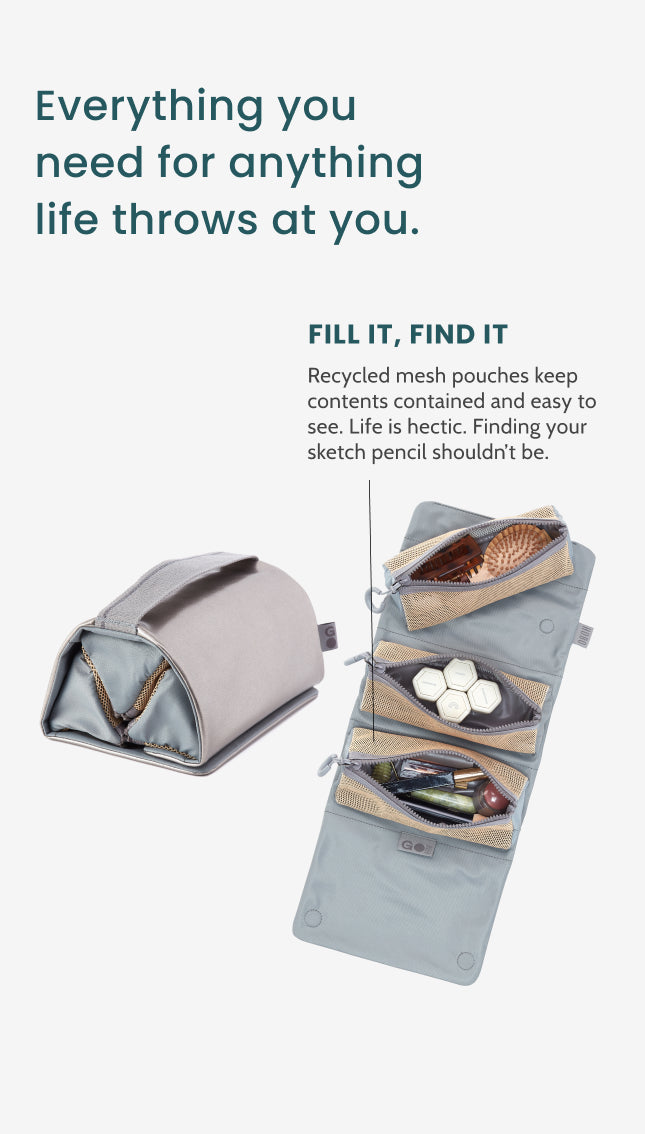 - 3 removable, magnetic recycled mesh and nylon zip pouches